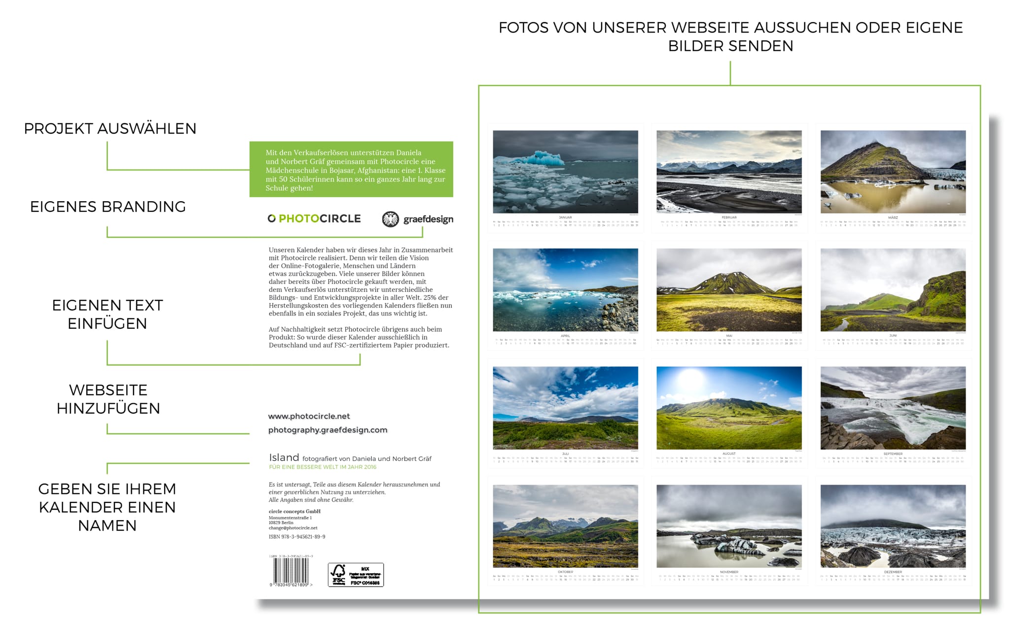 Mit verschiedenen Themen in zwei unterschiedlichen Formaten garantieren wir, dass für jeden Geschmack und Geldbeutel etwas dabei ist. Das i-Tüpfelchen? Photocircle Wandkalender sind nicht nur ein Augenschmaus, sondern dabei auch nachhaltig: Zur Herstellung unserer Kalender verwenden wir FSC-zertifiziertes Papier aus nachhaltiger Forstwirtschaft und pro verkauftem Kalender pflanzen wir für jeden Monat des Jahres einen Baum in Äthiopien.