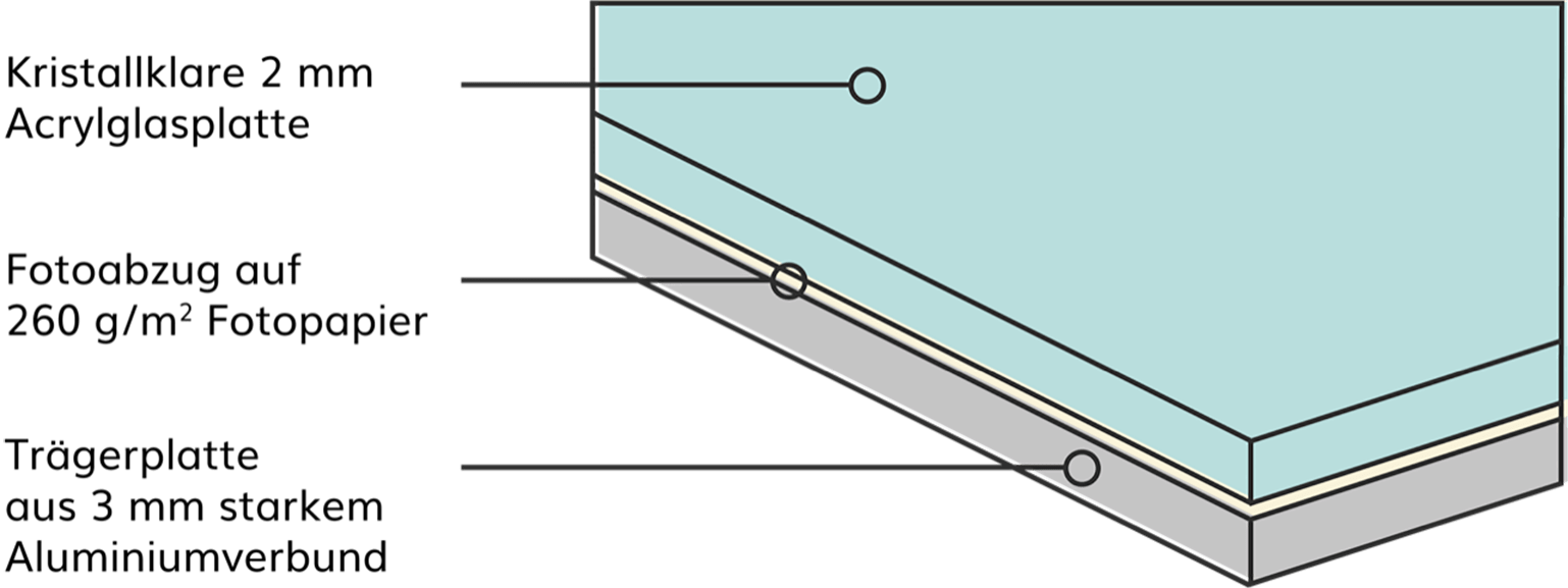 Unsere Acrylglasbilder versehen wir mit 2 mm starkem Acrylglas, das beim Betrachter für eine faszinierende Tiefenwirkung sorgt. Das kristallklare Acrylglas schützt Deine Fotokunst außerdem vor externen Einflüssen wie Staub, Schmutz oder UV-Strahlung. Unsere Belichter sind mit Hochleistungs-LED-Lasern ausgestattet. Dadurch erhalten Eure Fotografien hinter dem Acrylglas die maximale Dichte und jede Farbnuance wird perfekt dargestellt. Die Fertigung Deiner Acrylglas-Kaschierung wird bei uns selbstverständlich nur von ausgebildetem Fachpersonal durchgeführt und begleitet. Dank professioneller Verarbeitung, modernster Technologie und bester Materialien bleibt Dein Acrylglasbild ein dauerhafter Blickfang.